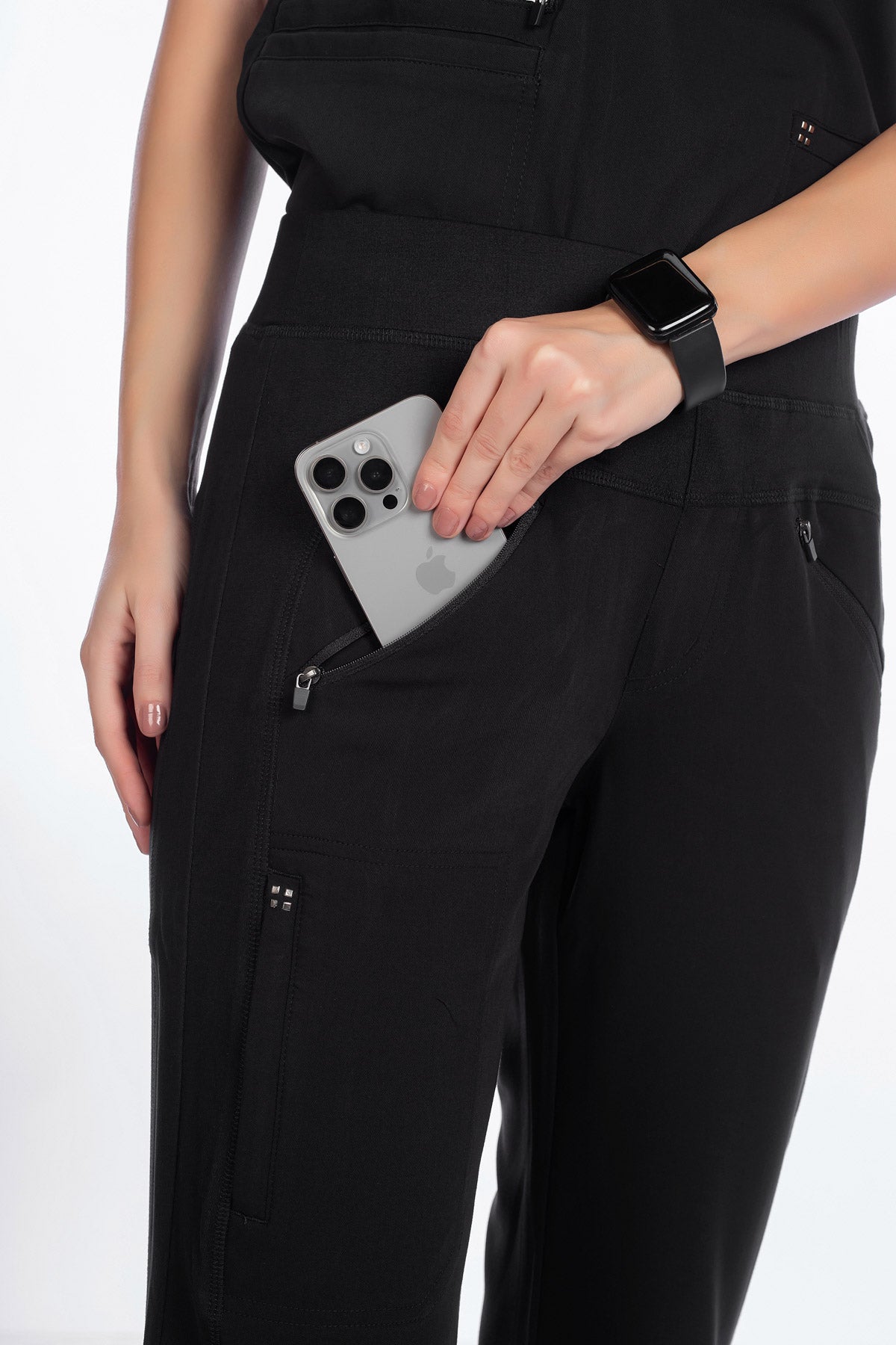 - 5 Pockets: 2 zipper hip pockets, 1 zipper cell phone pocket, 2 back pockets