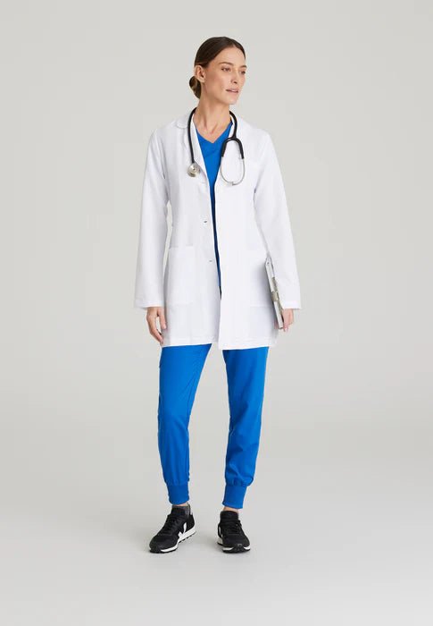 Grey’s Anatomy Signature Merinda's modern fit lab coat is body contoured for shape without being tight. Features loose button adjustable back belt and 4-way stretch for all-day comfort, features front pockets and a round notched collar to look and feel like the passionate professional you are.